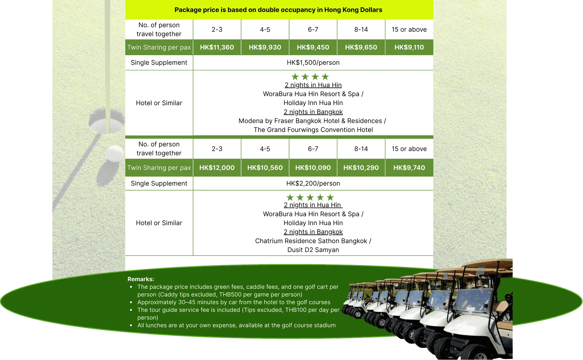 • Package price is per person based on double occupancy in Hong Kong Dollars and includes a round-trip Economy Class air ticket between Hong Kong and Bangkok with Hong Kong Airlines (V class). A surcharge for travelling in higher airfare classes or during peak seasons will be applied.