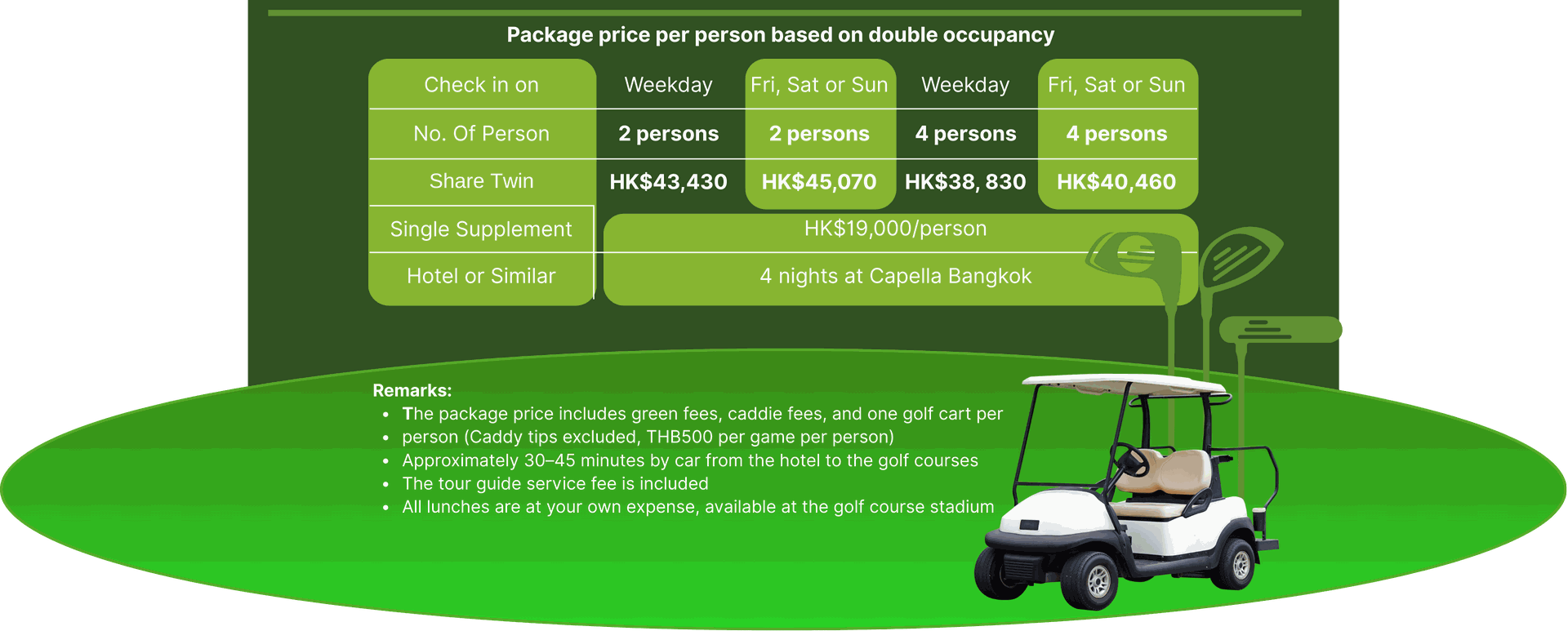 Indulge in the ultimate golfing getaway tailored for discerning players. This exclusive 5-day, 4-night package combines world-class golf with refined luxury in the heart of Bangkok. Tee off at four of Thailand's most prestigious courses —  Ballyshear Golf LinksRajpruek ClubRobinswood Golf Club, and the iconic  Thai Country Club — each offering immaculate fairways, elite service, and unforgettable play.
